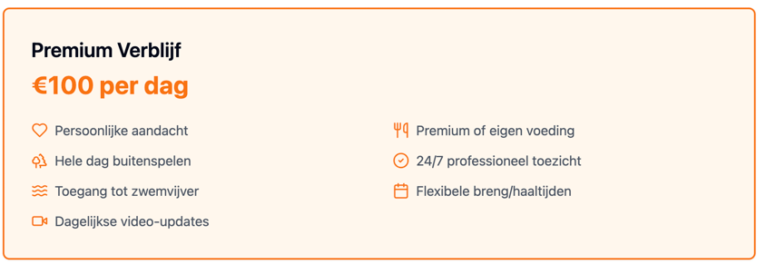 We kiezen bewust voor een hogere prijs dan reguliere pensions, omdat we elke hond de liefde en aandacht willen geven die ze thuis van hun baasjes krijgen. Dit betekent persoonlijke zorg, constante aandacht en vooral heel veel speeltijd in onze prachtige natuur. We behandelen uw hond zoals we onze eigen honden behandelen - als familie.